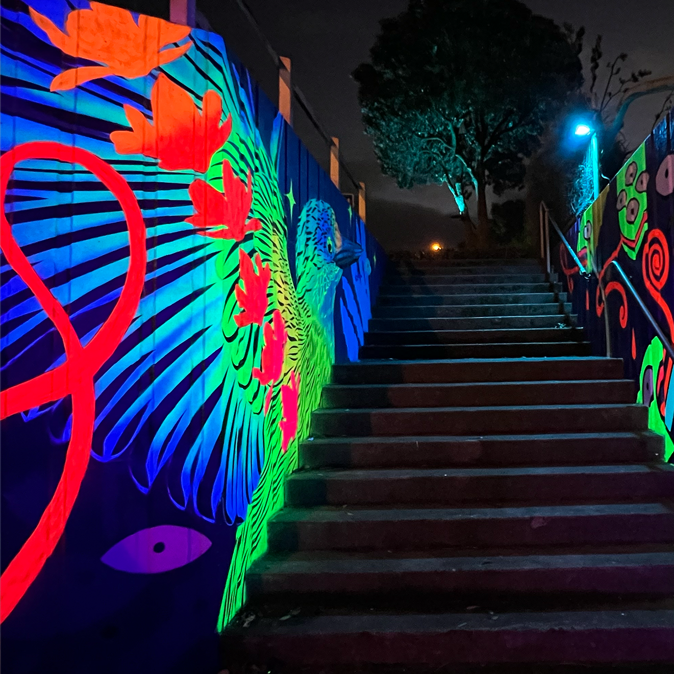 By FLOX x SWEATS This artwork is a continuation of our mural from last years’ Matariki FOL and pays homage to the unique geography and flora/fauna that form part of the Taranaki region, and to New Zealand species that are no longer with us. Painted with a popping palette of neon aerosol the mural was once again black lit during the festival, so at night the artwork glowed and came alive.