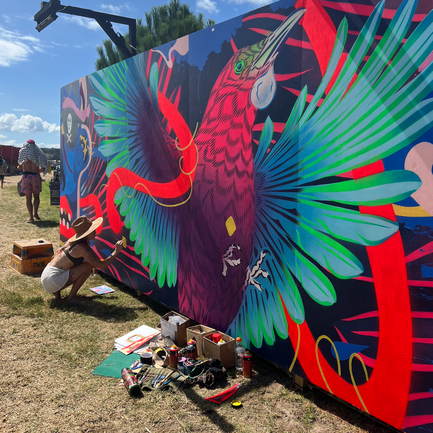 Shipwrecked, you were unreal! @sweats___ and I teamed up to create a six-panel mural that captured the festival’s energy, rhythm, and lush surroundings.Inspired by Shipwrecked’s deep roots in nature, music, and community, the mural came to life with bold colours, intricate stenciling, and flowing compositions that echo the free-spirited vibe of the festival. Painting live on-site, surrounded by beats, creativity, and the stunning landscape, was an experience like no other.