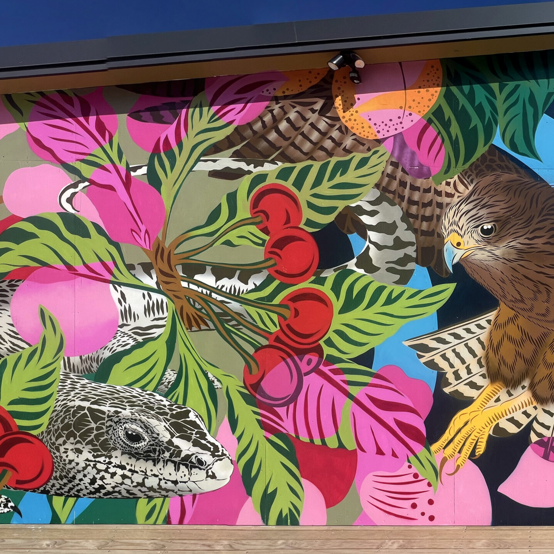 A big thank you to the team at Alexandra Primary school for having me, it was an honour to be able to leave my mark in your special community. My latest mural stands as a vibrant testament to the rich biodiversity of Aotearoa. I’ve brought to life the intricate dance between the Mokomoko (Otago skink) and the Kārearea (New Zealand Falcon), they tell a story of harmony and interconnectedness— a homage to the delicate balance that sustains the diverse ecosystems of Aotearoa.