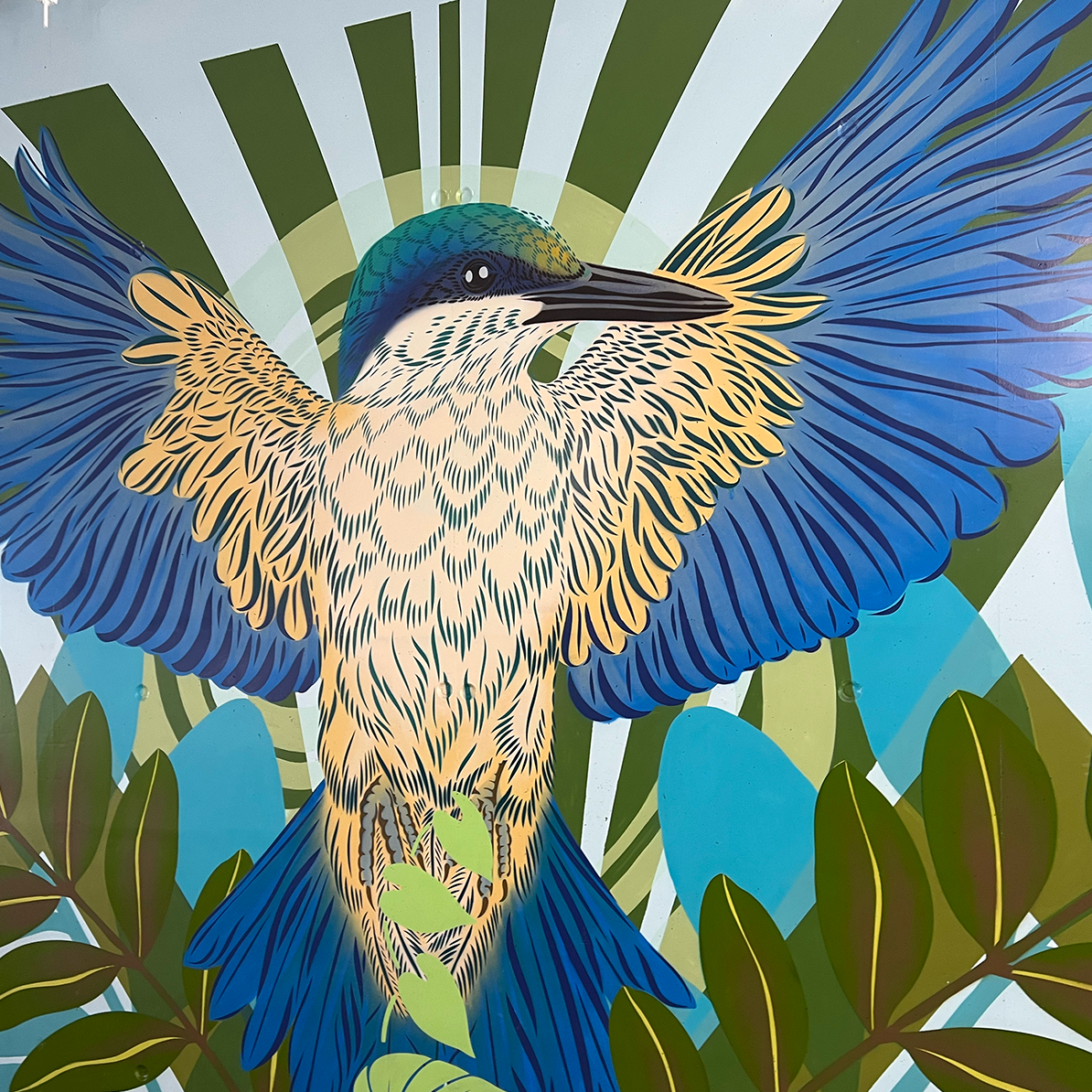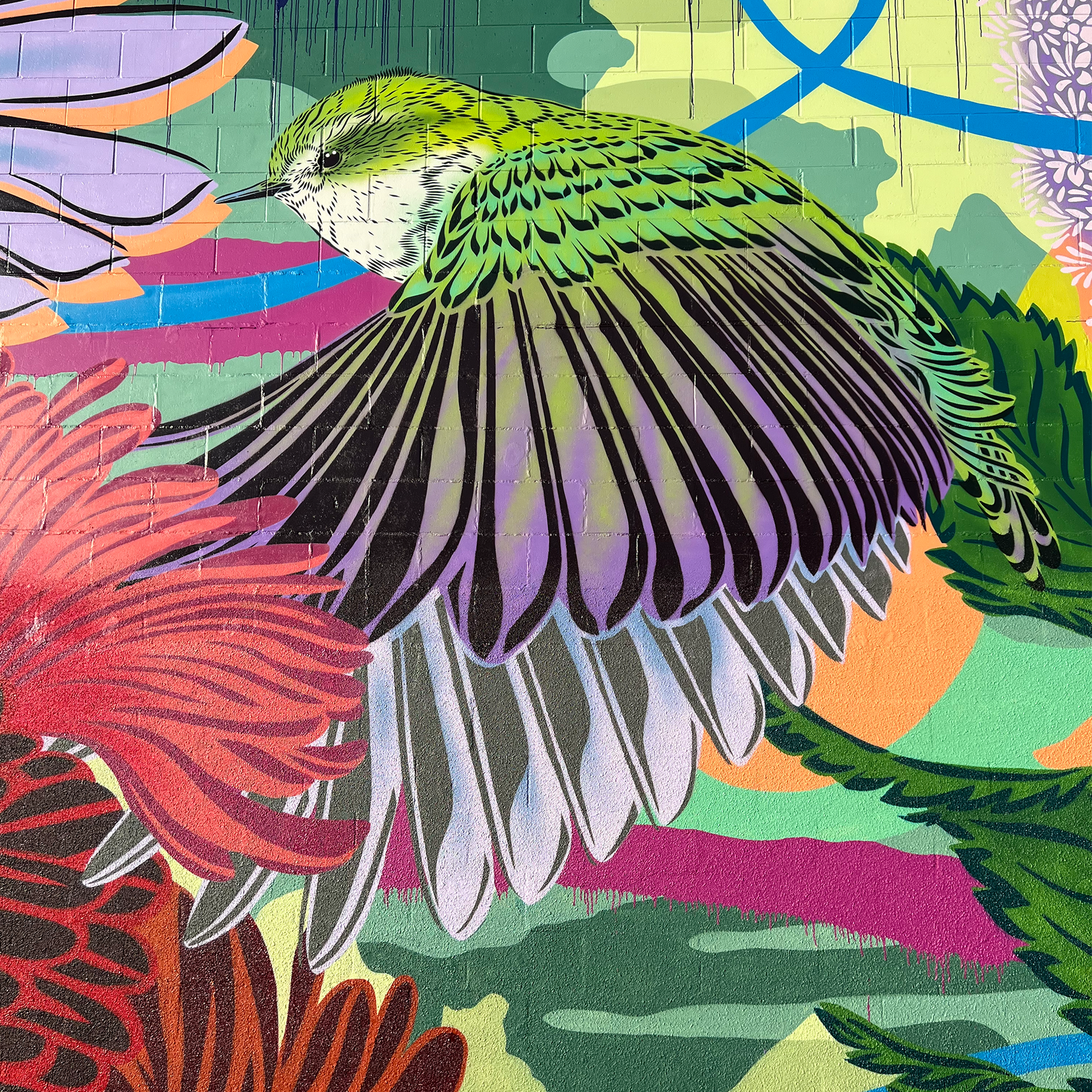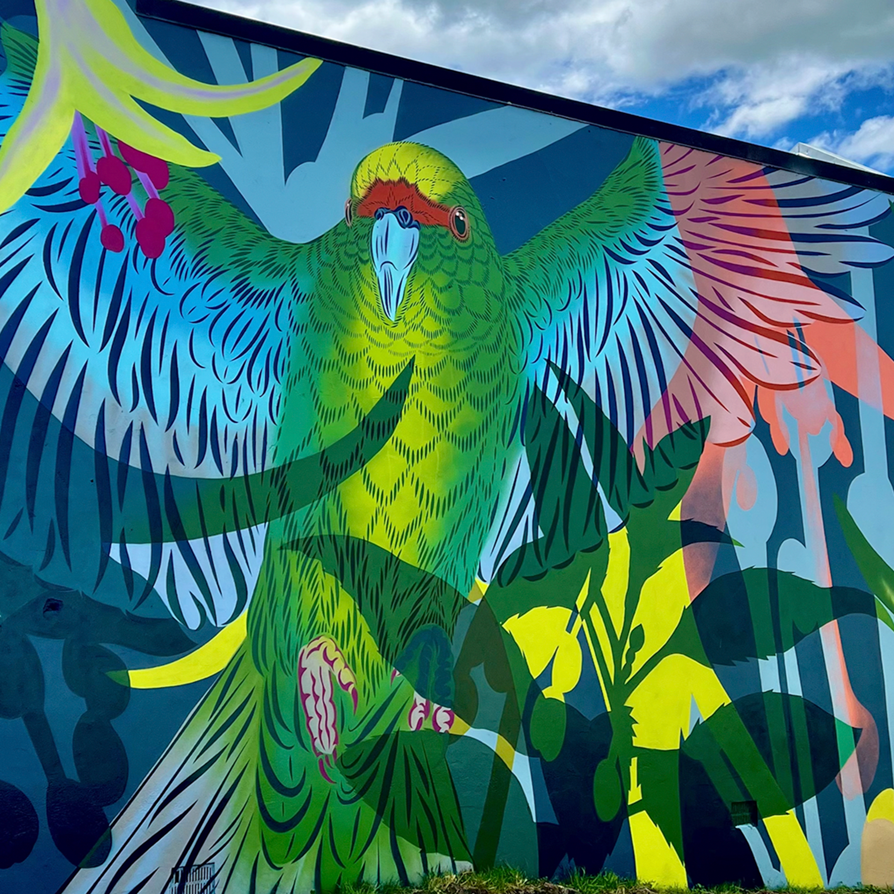 Although considered Aotearoa’s smallest bird, the Titipounamu is adaptable, and constantly on the move, a nod to the nomadic Kai Tahu people of Ōtepoti, but also the diverse South Dunedin communities of today. A resilient species around since Gondwana times, the three birds in flight make reference to the idea of South Dunedin and it’s ever shifting tides of change, from a geographical and social viewpoint.