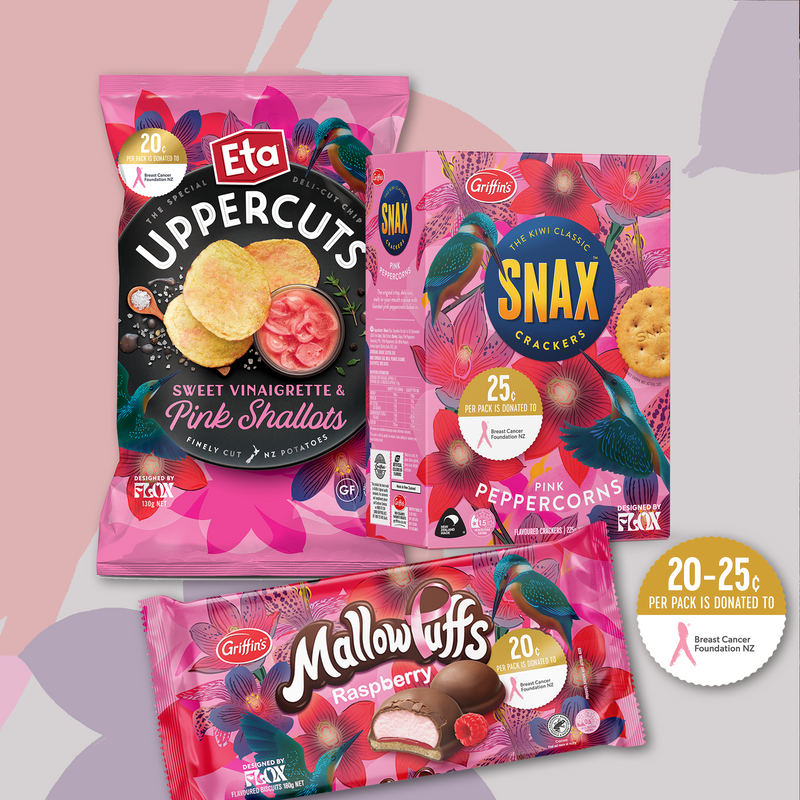 Griffin’s has wrapped three hand-picked products in a bespoke, bright bold-pink FLOX design for its latest partnership with Breast Cancer Foundation New Zealand (BCFNZ) that will raise nearly $300,000.