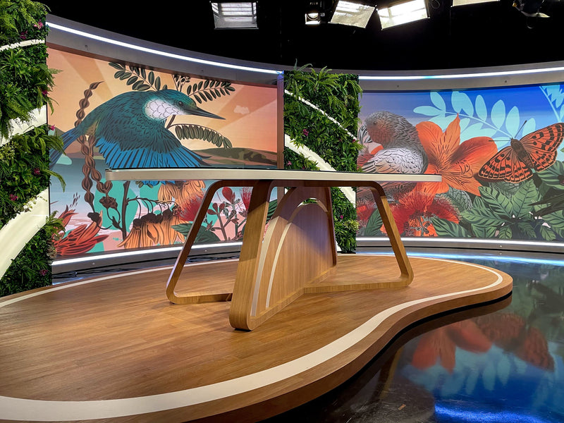 Showcased across a set of digital screens, my latest artworks breathe a fresh new feel into TVNZ’s Breakfast studio set, which has now returned to screen for 2022. Featuring a flock of our native birds: The Kotare, Kākāriki, Korimako and Kea nestled amongst a landscape filled with native flora, it’s a true celebration of Aotearoa’s environmental taonga.