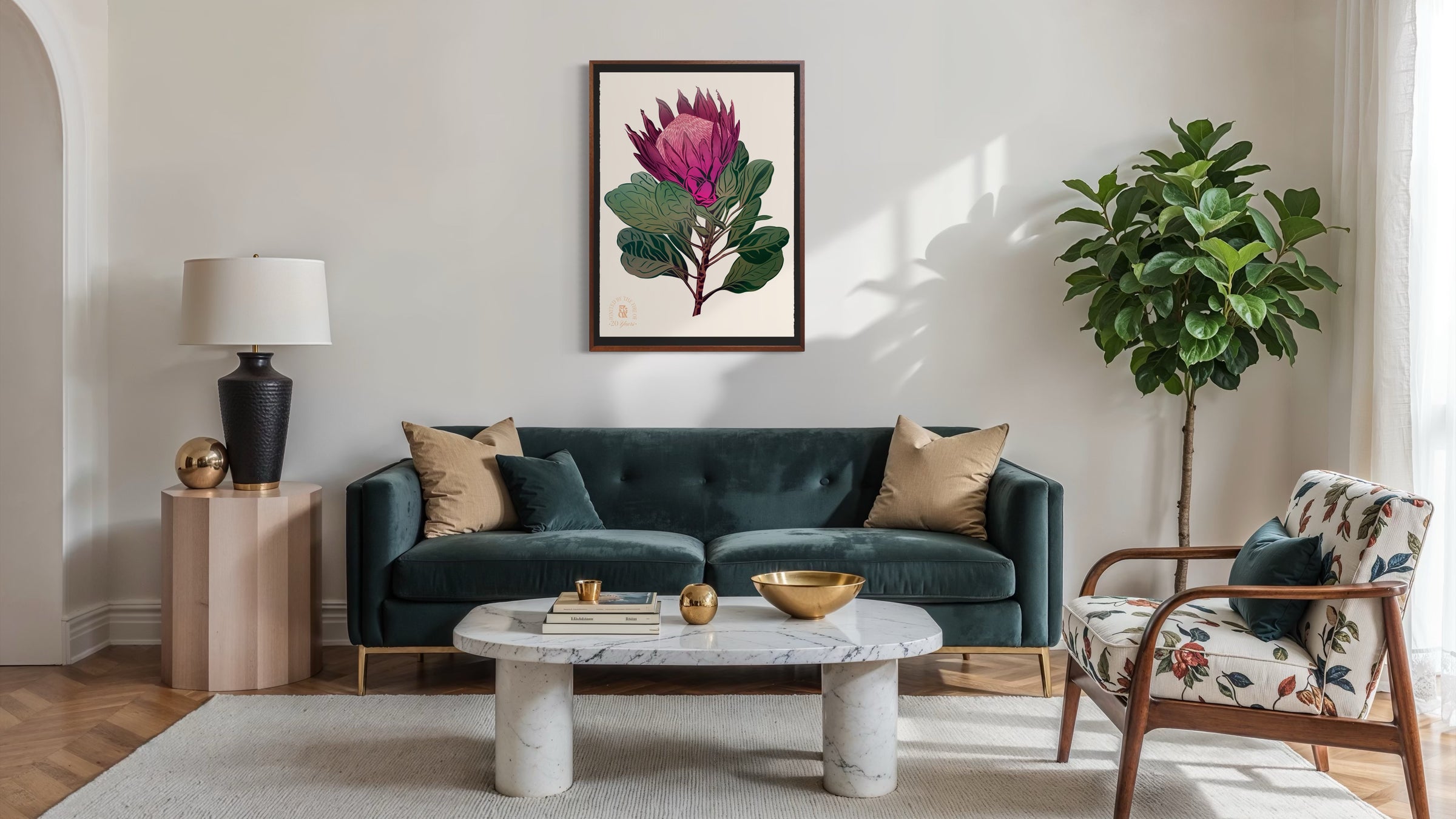 Each piece is meticulously painted on archival Fabriano paper and framed in FLOX’s new Dark Natural frame, designed to enhance the vibrancy and intricacy of her signature style.