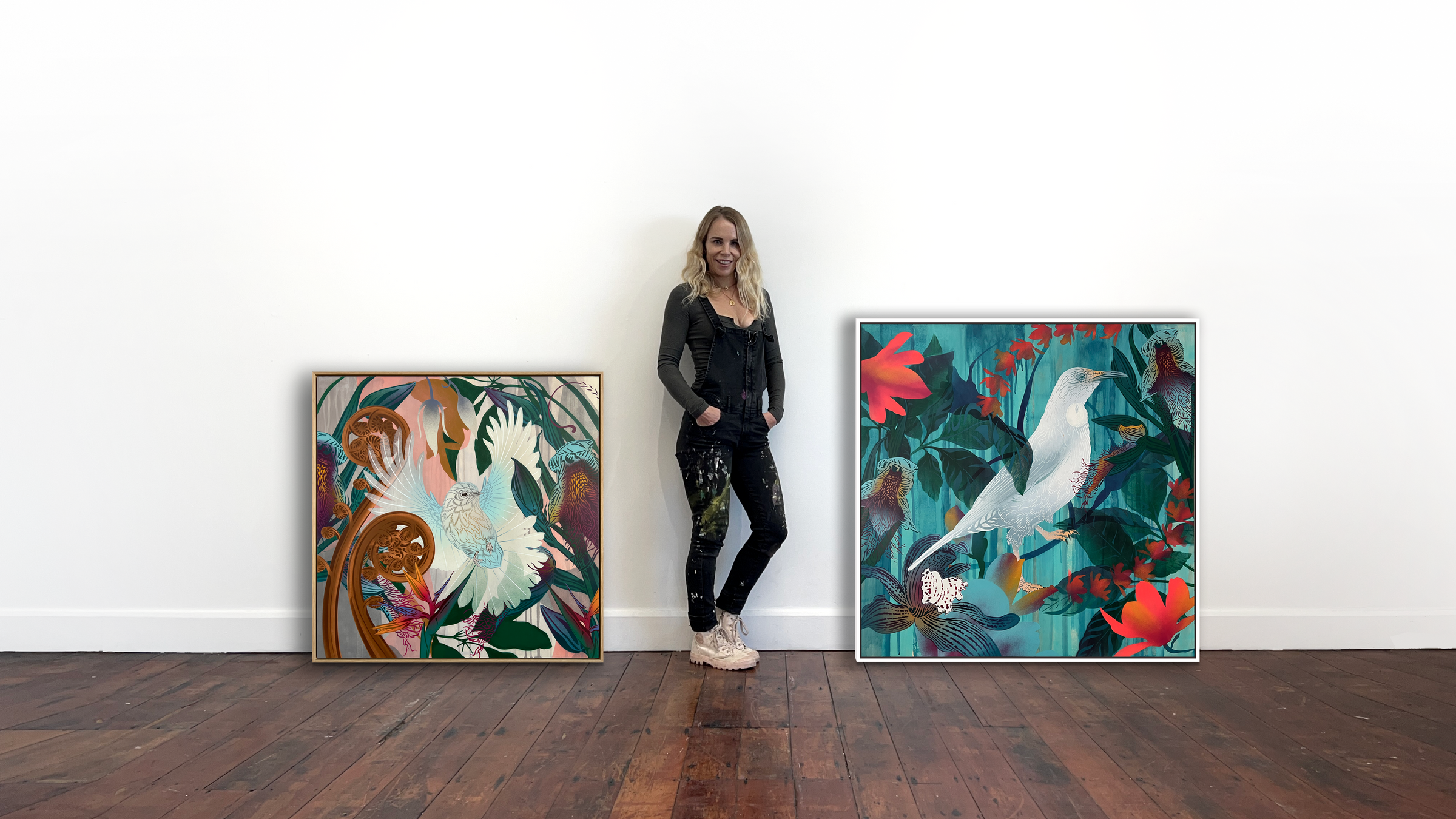 Using her distinctive stencil and spray paint techniques, FLOX plays with subtle overlays, soft textural drips and ghosted forms while her palettes are a mix of earthy tonal hues, and bright pops of colour.