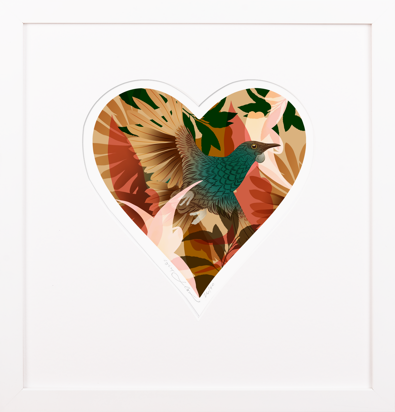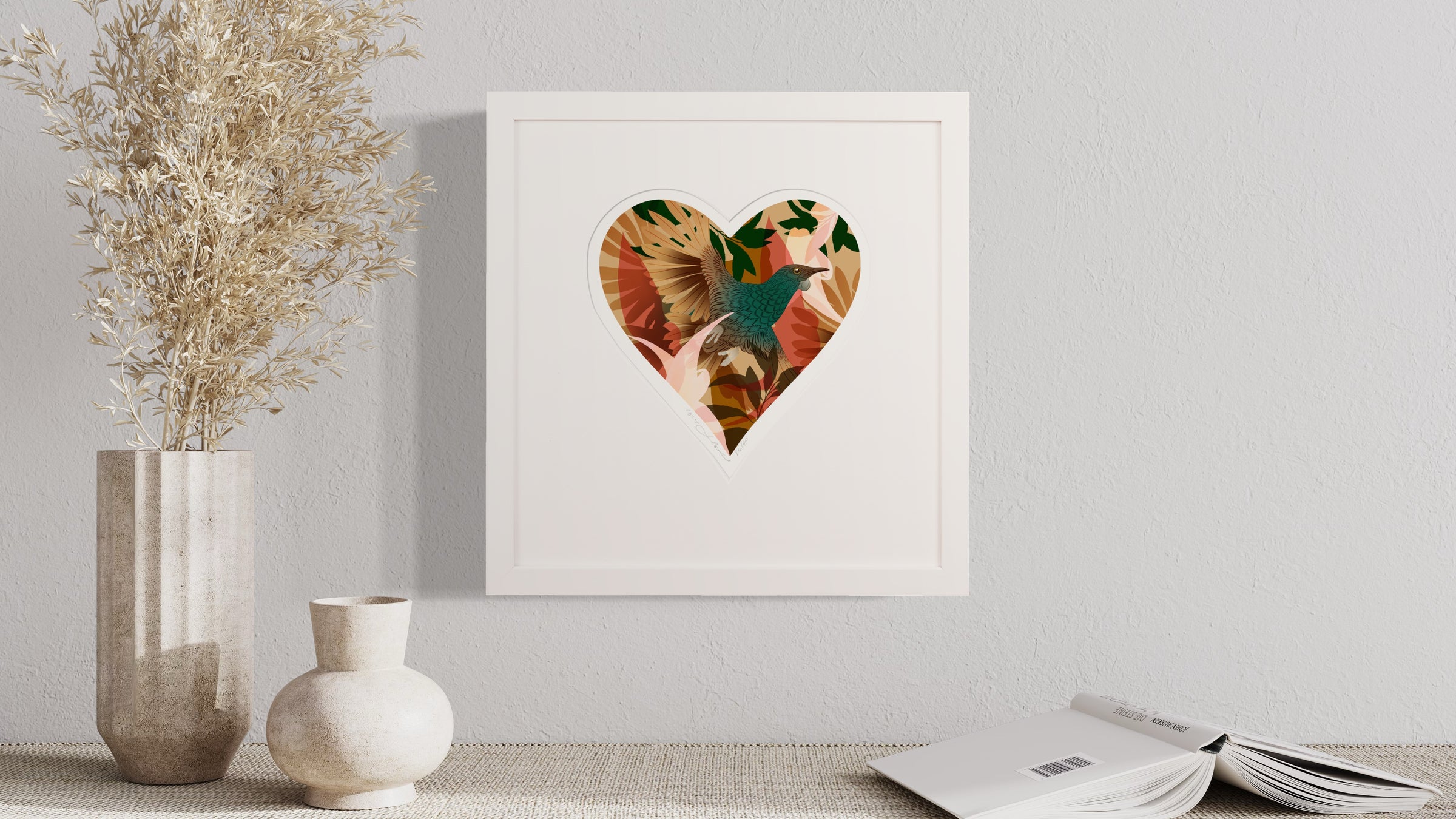 Elevate your piece with our bespoke framing that includes a custom heart-shaped mat board to further enhance the aroha.