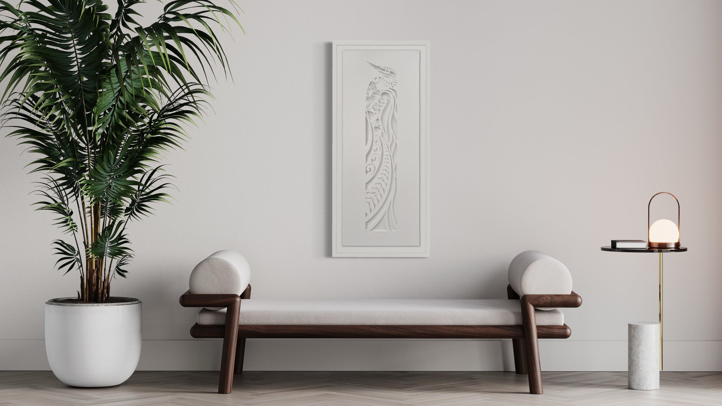 The Kumara plant, once a vital food source is enveloped by the revered Kōtuku (White Heron), while the flow and rhythm of the birds feathers make reference to our land and water.
