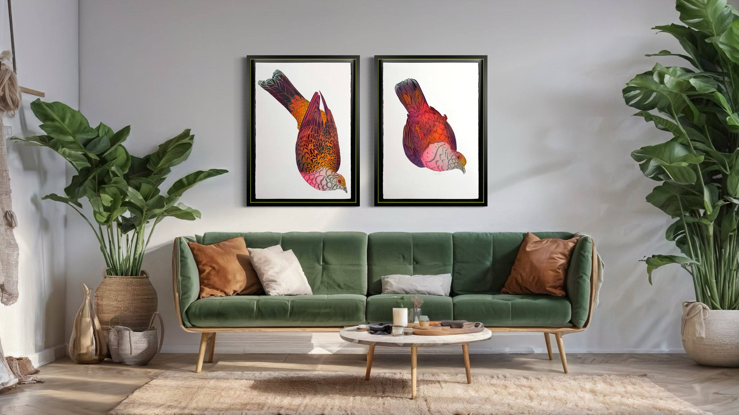 With only two artworks in the range and meticulously painted on archival paper, these artworks are framed in a sleek black float mount, elevated by the addition of neon internal spacers that subtly accentuate its modern edge.