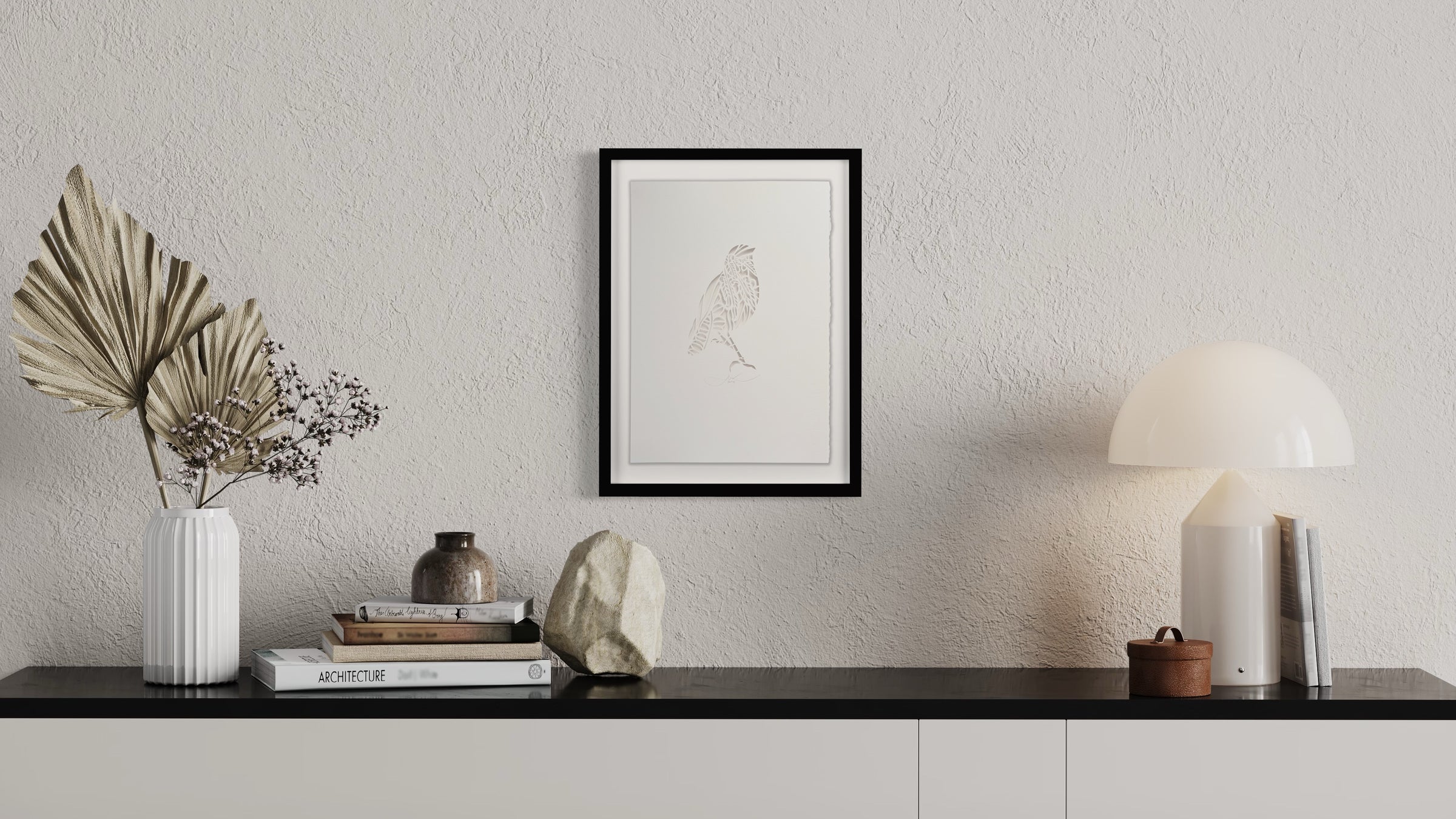Choose to take unframed, or frame with a float mount box frame, accentuating the play on shadows as the light travels through the cuts of the stencil.