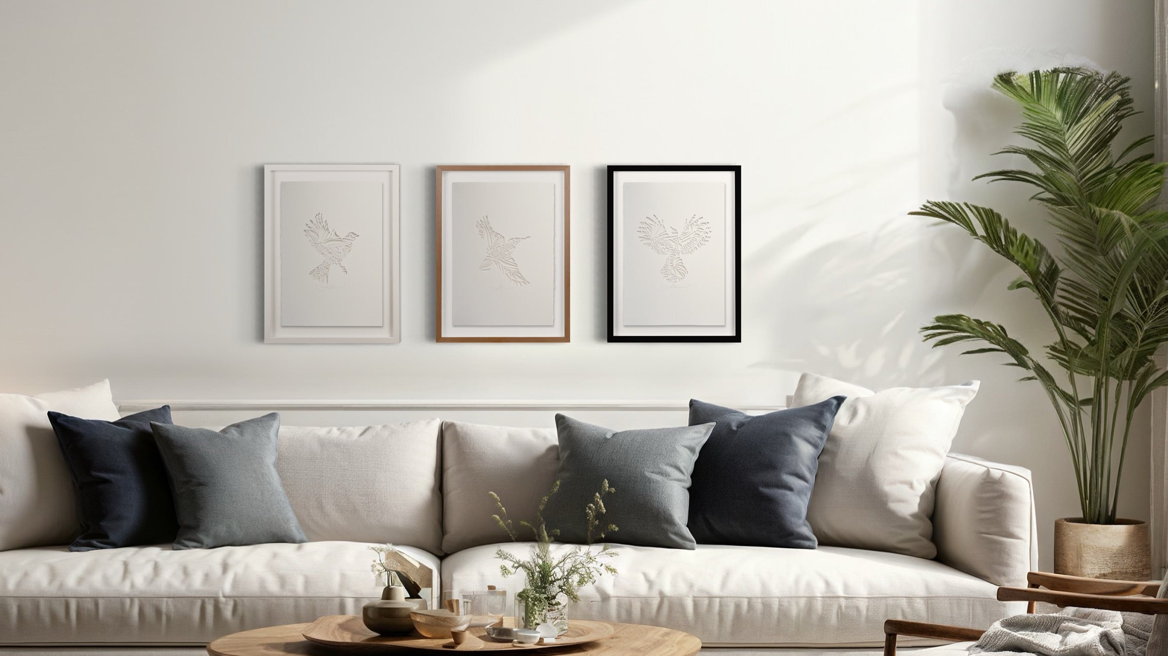 Choose to take unframed, or frame with a float mount box frame, accentuating the play on shadows as the light travels through the cuts of the stencil.