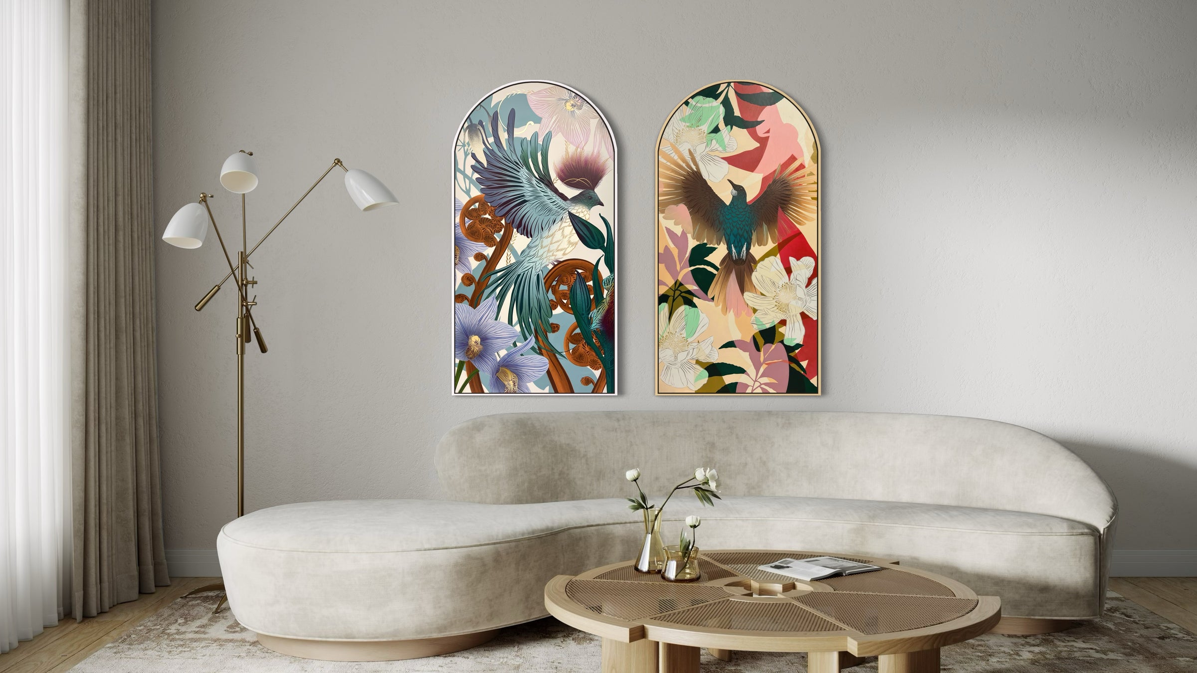 Using her distinctive stencil and spray paint techniques, FLOX plays with subtle overlays, soft textural drips and ghosted forms while her palettes are a mix of earthy tonal hues, and bright pops of colour. Just as her outdoor murals offer a contrast of nature within their urban contexts, a FLOX Arch within the home acts as a connector, forging a sense of identity to mother nature and the land we call home.